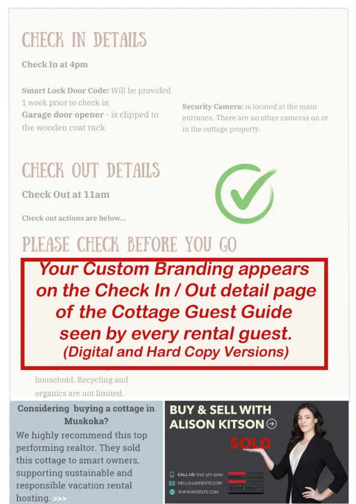 - Your branding is embedded in the custom on-site marketing material for incoming guests’ eyes. Your individual realtor branding will appear right in our guest welcome guide (digital and hard copy), provided to every guest at every property you refer to us
